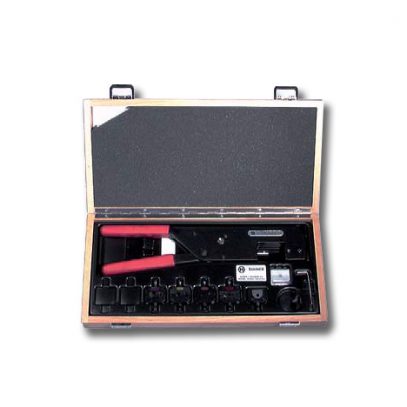 Huber+Suhner large Crimp Tool in wooden box complete with interchangeable inserts 1/2A, 2B, 2C, 3D.