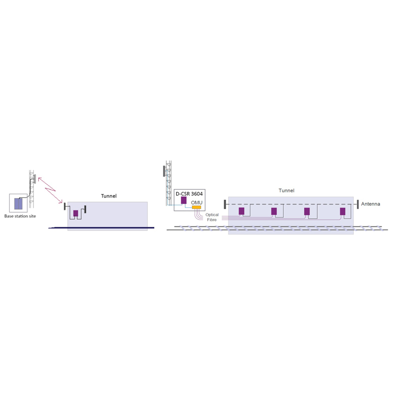 The D-CSR 3604 can also be used to provide coverage in shorter tunnels. Longer tunnels can be covered by connecting the repeater to an OMU (Optical Master Unit) that feeds a number of fibre fed repeaters.